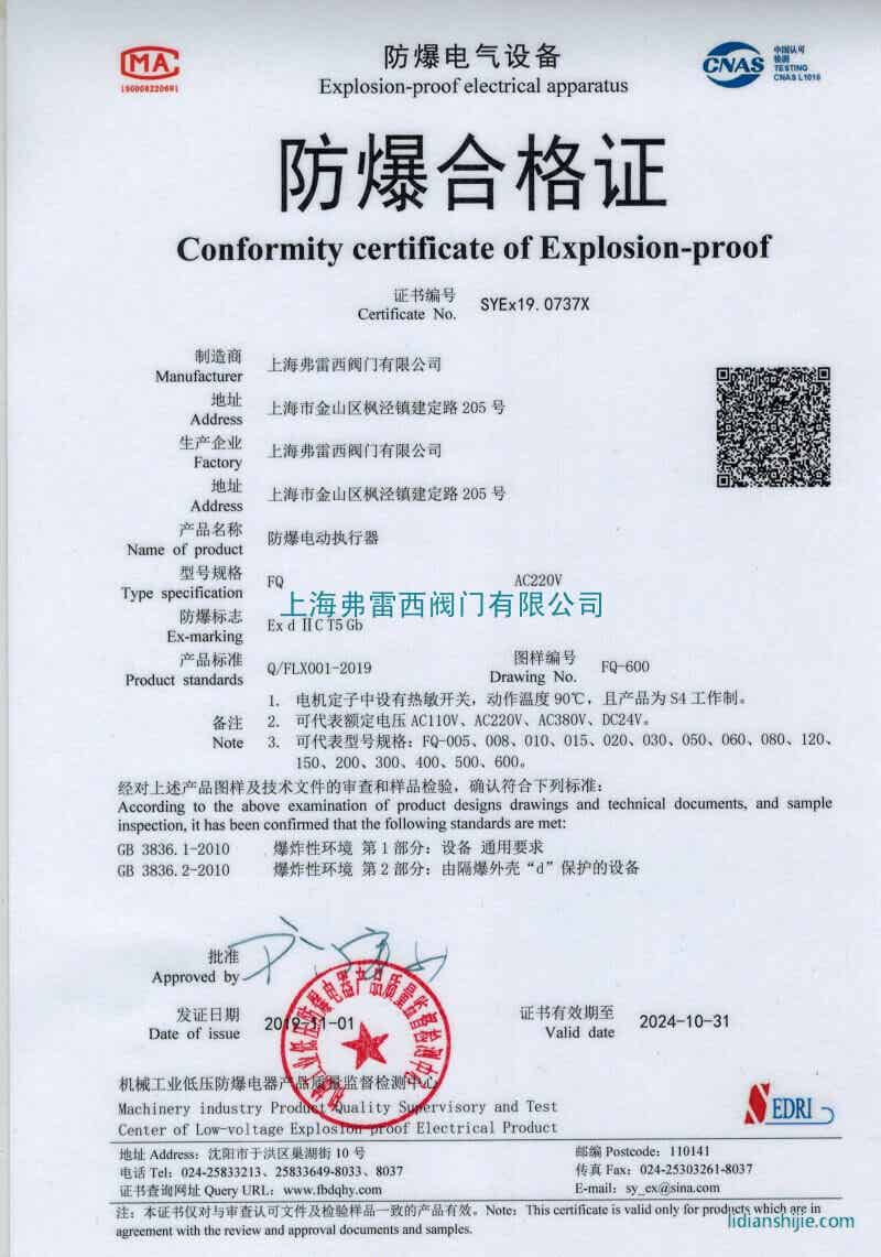 弗雷西防爆電動頭獲得防爆證書認(rèn)可