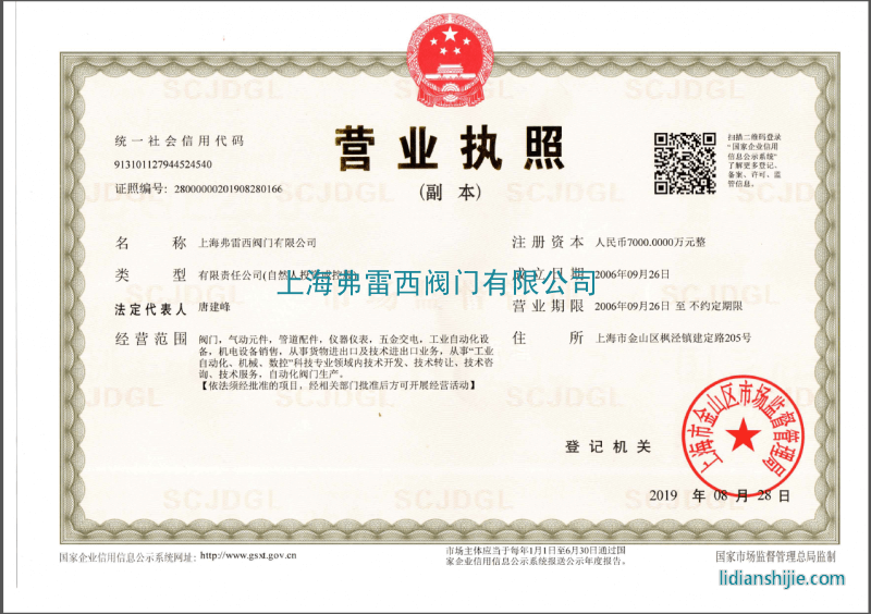 | 發證機構 | 上海市金山區市場監督管理局 | 發證時間 | 2019-08-28 |