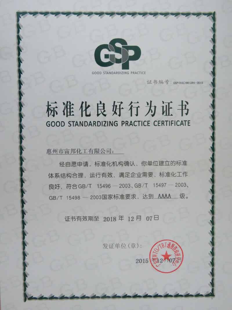 此次評審中,專家組對惠州宙邦的標(biāo)準(zhǔn)化體系文件以及相關(guān)記錄進(jìn)行了抽查,對生產(chǎn)現(xiàn)場進(jìn)行了審查確認(rèn)。最后專家組一致認(rèn)為:惠州宙邦實施各項標(biāo)準(zhǔn)化工作進(jìn)展順利、效果良好,創(chuàng)建“企業(yè)標(biāo)準(zhǔn)化良好行為”的工作扎實,標(biāo)準(zhǔn)化文件齊全,體系結(jié)構(gòu)合理,企業(yè)建立的標(biāo)準(zhǔn)體系符合國家標(biāo)準(zhǔn)的要求,滿足了企業(yè)生產(chǎn)、經(jīng)營管理的實際需要,運行有效。經(jīng)專家組現(xiàn)場打分,惠州宙邦以總分475分的優(yōu)異成績獲得“AAAA級標(biāo)準(zhǔn)化良好行為企業(yè)”殊榮。同時,惠州宙邦獲得了由惠州大亞灣區(qū)石化產(chǎn)業(yè)綜合標(biāo)準(zhǔn)化建設(shè)示范區(qū)創(chuàng)建項目組提供的專項獎勵資金3萬元。