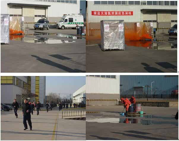 2016年12月16日上午,我公司與市環保局大孤山半島分局聯合舉行液氨泄漏應急演練。在我公司廠院內,參演隊伍模擬了險情突發、啟動公司三級生產安全事故應急預案、噴淋稀釋、人員疏散、員工穿防化服搶修、上報相關部門和單位、聯絡外部協助、收集廢液、防化服洗消、環保監測評估等細節。演練獲得圓滿成功,受到環保局的贊賞。