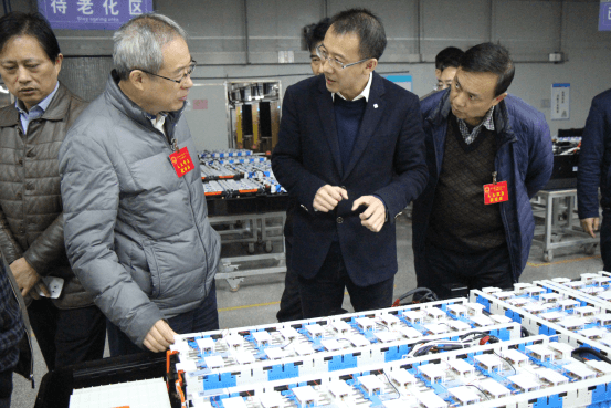 蔡棟向張鑒武介紹動力電池組的成組工藝及應用