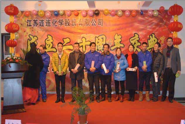 2016年2月1日,慶祝江蘇連連化學股份有限公司成立二十周年慶典晚會在連連化學集團大樓隆重舉行。連連化學董事長兼研發(fā)中心主任連加松先生致開幕辭,分享了公司這20年來的奮斗歷程,總經(jīng)理蔡平杰先生做新春致辭及宣讀2016年優(yōu)秀員工名單。晚會由副總經(jīng)理秦君林先生負責總的策劃與主持。