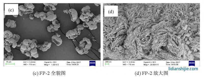 圖 2.7 是 Fe PO4·2H2O 和無水 Fe PO4的掃描電鏡圖,與氨水沉淀制備的十分相似,只是在具體細節(jié)上有所區(qū)別。控制結(jié)晶法制得的 Fe PO4·2H2O 呈類球形;經(jīng)過陳化晶化處理,F(xiàn)e PO4·2H2O 顆粒明顯增大,變成球殼狀,具有微納米結(jié)構(gòu);600 ℃焙燒處理制得的無水 Fe PO4基本保持了燒前 Fe PO4·2H2O 的形貌,仍為球殼狀。
