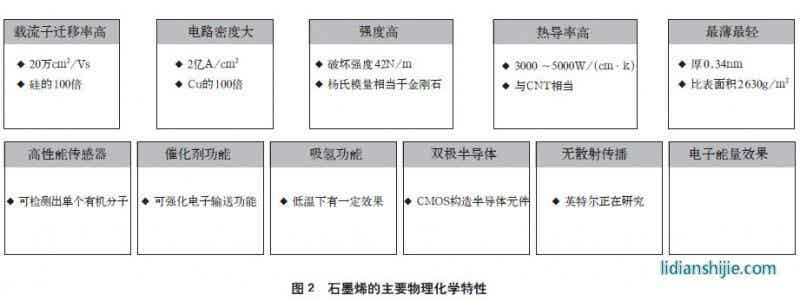 現(xiàn),2位教授共同在2010年獲得諾貝爾物理學(xué)獎。在此背景下,石墨烯的眾多方向研究如火如荼的展開,并且迅速在全球范圍里掀起了石墨烯制備、石墨烯復(fù)合技術(shù)和材料、石墨烯下游產(chǎn)品等的研究熱潮。石墨烯材料超強(qiáng)的物理、化學(xué)和機(jī)械等主要特性如圖2所示。