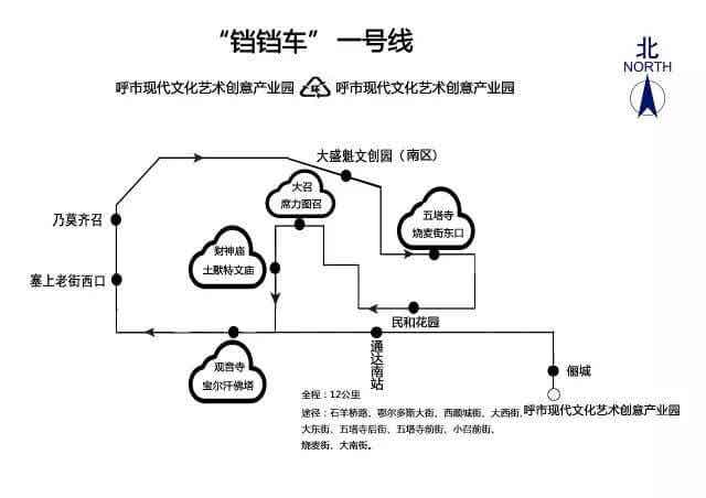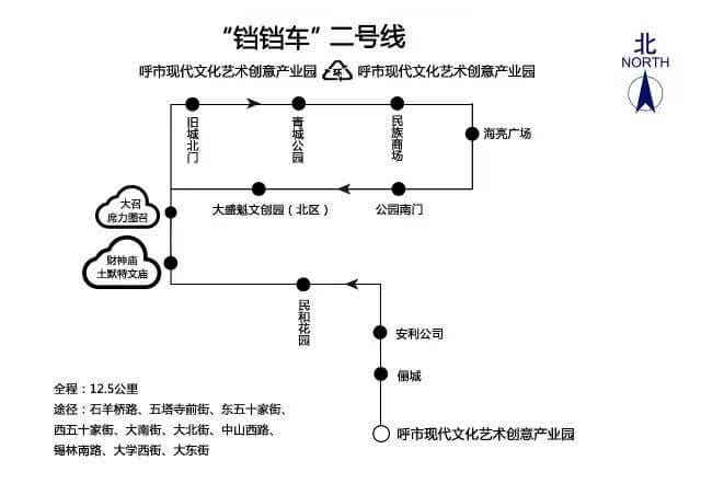 沿途設(shè)站:呼市現(xiàn)代文化藝術(shù)創(chuàng)意產(chǎn)業(yè)園、儷城、安利公司、民和花園、財(cái)神廟(土默特文廟)、大召(席力圖召)、舊城北門、青城公園、民族商場、海亮廣場、公園南門、大盛魁文創(chuàng)園(北區(qū))、大召(席力圖召)、財(cái)神廟(土默特文廟)、呼市現(xiàn)代文化藝術(shù)創(chuàng)意產(chǎn)業(yè)園、儷城、安利公司。