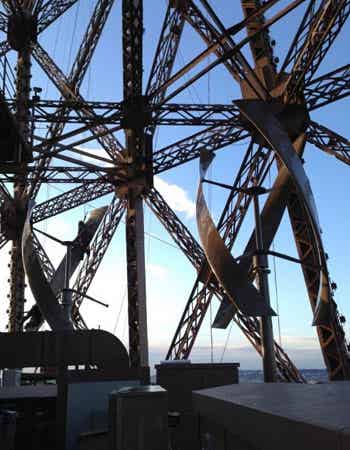 但是它們不像埃菲爾鐵塔外部的燈飾那樣顯眼,渦輪機的位置并不引人注意。它們距地面400英尺(約122米)高,完美地與鐵塔的材質結構相結合,在高處默默運行。但是千萬別小瞧了這些隱藏起來的機器。UGE表示,這種強大的垂直軸渦輪機可以利用任何風向的風能。