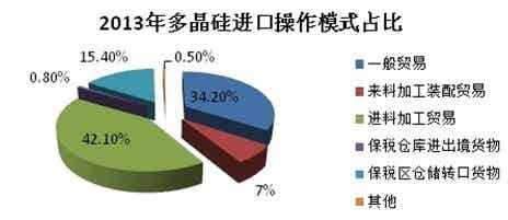業(yè)內(nèi)人士稱,因?qū)n國最大的多晶硅企業(yè)OCI僅征稅2.4%,可以說多晶硅“雙反”主要針對美國。但美國通過加工貿(mào)易的方式有效規(guī)避征稅,2013年通過進料加工貿(mào)易的方式進口多晶硅的比例增加至42.1%,一般貿(mào)易方式占比從2012年的50%左右減少至2013年的34.2%(如下圖)。