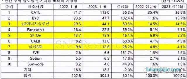 根據SNE research 的數據,2023年上半年,雖然寧德時代依然占據了全球36.8%的市場,甚至全球市占率還提高了1.4個百分點,但比亞迪更加瘋狂,市占率上升4.1個百分點來到15.7%,與寧德時代的差距也從去年落后23.8個百分點縮小到21.1個百分點。