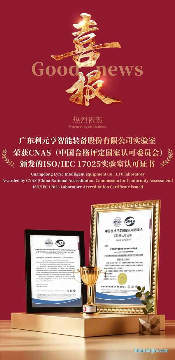 近日,利元亨實驗室榮獲由CNAS頒發的ISO/IEC 17025實驗室認可證書。