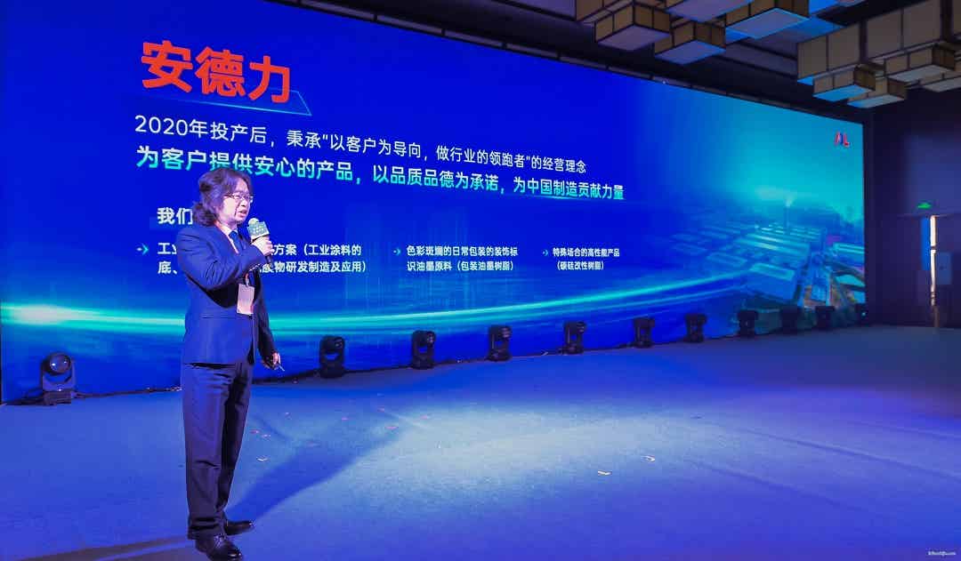 江西安德力高新科技有限公司副總經(jīng)理王立峰先生,介紹了安德力在環(huán)保油墨樹(shù)脂、水性工業(yè)涂料樹(shù)脂、碳硅改性材料的性能及應(yīng)用,為多個(gè)行業(yè)提供了綠色、高效的應(yīng)用解決方案。