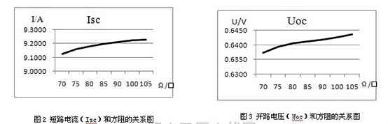 實驗結果表明:對于高電阻率的太陽能電池片,其輸出特性短路電流Isc和開路電壓Uoc會隨著方阻的增長呈線性增長趨勢,如圖2、3所示;填充因子FF會隨著方阻的增加呈緩慢下降