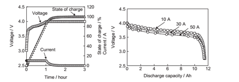 能才能縮短起飛的時間。圖4所示,相同的充時后,以10、30及50A的電流值放電至2.75V時的放電特性。可以確認(rèn)放電電流增大時極化也增大,電池電壓下降。在50A(5ItA)放電時其放電容量是10A放電時99%以上的容量。這種良好的放電性能實(shí)現(xiàn)了電池材料及電極的配方最佳化。