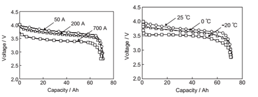 評價LVP65電池的放電性能,在25℃的環(huán)境溫度中以70A的恒電流充電至電壓4.025V,接著繼續(xù)以相同的恒電壓充電3小時后,再以50、200及700A的電流值放電至2.75V,其放電特性示于圖5。并可確認(rèn)電流值大極化也增大,隨之而來的是電池電壓下降。既便是在700A(約10ItA)以50A放電時最高可獲得97%的容量。接著因環(huán)境溫度的影響。在相同的條件下充電,環(huán)境溫度從-20、0及25℃之后,電池溫度達(dá)到與環(huán)境溫度相同經(jīng)過充分的時間放置后,以70A電流放電至2.75V,此時的特性示于圖6。環(huán)境溫度越低,電池電壓越低,在-20℃的低溫條件下最高可獲得25℃時放電容量的98%。也就是說,LVP65電池可用作寬溫范圍的飛機(jī)用途,并可維持優(yōu)良的放電性能。