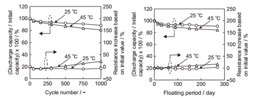 45℃(△)循環(huán)時的充放電循環(huán)壽命性能。 及4.025V浮充條件下的日歷性能。該電池在