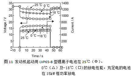 LVP65-8電池組發(fā)動機(jī)起動放電時的電壓變化示于圖11。試驗(yàn)條件是在25℃的環(huán)境溫度中使LVP65-8電池組以70A的恒電流充電到32.2V,接著繼續(xù)以相同的電壓合計(jì)充電3小時后,在環(huán)境溫度25、0及-18℃的條件下進(jìn)行15kw的恒電流放電。由圖得知,放電時的峰值電流溫度越低越大,在-18度時超過650A。但是,在這種低溫大電流放電的條件下,本電池組也能維持20V以上的電壓,具有良好的起動性能。