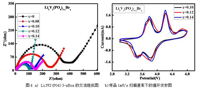 圖4b)是各個Li3V2(PO4)3-xBrx樣品在1mV/s掃描速率下的循環伏安圖。由圖中可以看出,充電過程中總共有4個峰,放電過程中總共有3個峰。充電時,在 3.6~3.7V出現了兩個峰,對應2.3節中的第1個和第2個充電平臺,原因是有一個V從+3價氧化為+4價,并脫出第一個Li+,晶體結構發生了一定變化[15];在4.1V附近出現了第3個峰,對應2.3節中第3個充電平臺,此時剩下的另一個V從+3價氧化成+4;在4.6V左右出現的第4個峰,對應2.3節中的第4個充電平臺,這時V從+4價變為+5價。放電過程中三個還原峰分別出現在3.8V、3.57V和3.47V附近。氧化峰與還原峰的位置與文獻報道的相近,并且與充放電測試的結果相吻合。