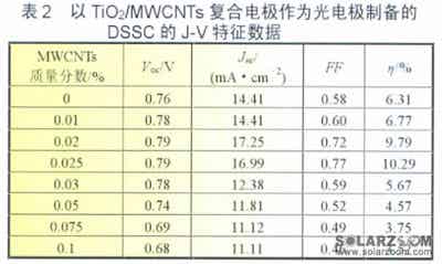 在前人的工作基礎(chǔ)上,ThanyaratSawatsuk等人將TiO2/MWCNTs復(fù)合電極中MWCNTs的含量限制在質(zhì)量分?jǐn)?shù)為00.1%做了進(jìn)一步的研究。采用直接混合的方法將TiO2/MWCNTs(00.1%)和乙基纖維素(100mg)分散在松油醇中進(jìn)行超聲波處理。用絲網(wǎng)印刷技術(shù)將TiO2/MWCNTs薄膜刷在ITO玻璃襯底上(面積為2cm×3cm,方電阻為10),在500煅燒。以復(fù)合電極作為光電極,以鍍Pt的FTO玻璃作為對電極裝備電池并測試。表2為以TiO2/MWCNT復(fù)合電極作為光電極制備的DSSC的J-V特征數(shù)據(jù)由表中數(shù)據(jù)可以看出,在TiO2中加入MWCNTs的質(zhì)量分?jǐn)?shù)為0.025%時(shí)性能最佳,電池轉(zhuǎn)換效率達(dá)到了10.29%。
