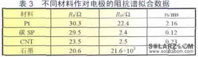 S.Gagliardi等人分別研究了石墨、碳納米粉和碳納米管作為對電極時(shí)電池DSSC的阻抗譜,阻抗擬合數(shù)據(jù)如表3所示。從表中數(shù)據(jù)可以看出,碳納米管的電荷傳遞電阻(Rct)的值在2.4~2.5Ω,而Pt催化電極的卻達(dá)到22.4Ω,多層碳納米管比Pt電極有更低的串聯(lián)電阻(Rs)和電荷傳遞電阻,用它作為DSSC的對電極將使填充因子和效率大大提高。這個(gè)現(xiàn)象可解釋為納米結(jié)構(gòu)的碳不僅能提高表面的電化學(xué)活性,也能提高碘/碘化物氧化還原對的催化活性。石墨的串聯(lián)電阻和電荷傳遞電阻都較大,不適合替代Pt催化電極。