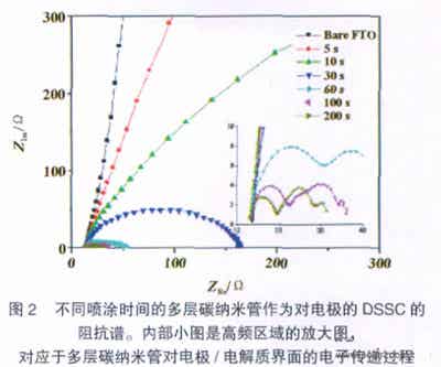 EaswaramoorthiRamasamy等人研究了多層碳納米管作為DSSC的對電極時(shí),碳膜噴涂時(shí)間對電池性能的影響。將100mg的多層碳納米管加入到100mL的無水乙醇中并用超聲波處理1h,然后用便攜式噴槍將溶液噴涂在120℃的FTO玻璃襯底上,按照噴涂時(shí)間5~200s將薄膜分成六種。噴涂時(shí)間決定了碳膜的厚度,噴涂時(shí)間越長,碳膜越厚。工作電極包含了兩層:約15μm厚的TiO2層和4μm厚的光散射層,TiO2電極在500℃燒結(jié)30min,然后浸入到5×104mol/L的N719染料中24h,待染料浸入到TiO2電極中后再用無水乙醇沖洗,然后用噴涂好的多層碳納米管作為對電極組裝電池,用絕緣膠將電極材料密封起來,注入液體電解質(zhì)進(jìn)行電池性能測試。圖2是不同噴涂時(shí)間的碳納米管作為對電極的DSSC阻抗譜,從圖中可以看出,隨著碳納米管噴涂時(shí)間的變長,電荷轉(zhuǎn)移電阻下降,噴涂200s時(shí)對應(yīng)的電荷轉(zhuǎn)移電阻為2.34Ω,這也說明,碳膜越厚,電池性能越佳,最大光電轉(zhuǎn)換效率為7.59%。