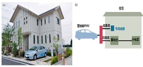 (a)從普銳斯PHV的普通充電接口將電力輸送給室內(nèi)的蓄電池儲存。(b)日常使用時將汽車輸出的電力儲存于蓄電池內(nèi)使用。