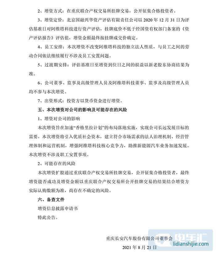 這一增資項目隨即出現(xiàn)在重慶產(chǎn)權(quán)交易所官網(wǎng)。官網(wǎng)信息顯示,該項目擬以現(xiàn)金方式進行增資擴股,長安汽車以非公開協(xié)議方式參與本次增資,價格與外部投資人保持一致。增資完成后,阿維塔科技原股東持股不低于39%。項目掛牌起止日前為8月23日至10月21日。