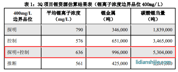 公告顯示,根據Neo Lithium在今年6月更新的評估報告,3Q項目碳酸鋰當量總資源量約 756.5萬噸,其中,探明+控制級碳酸鋰當量資源量為530.4萬噸,平均鋰離子濃度為636mg/L。