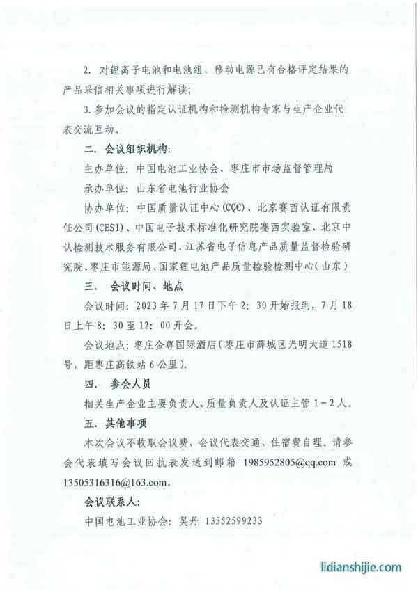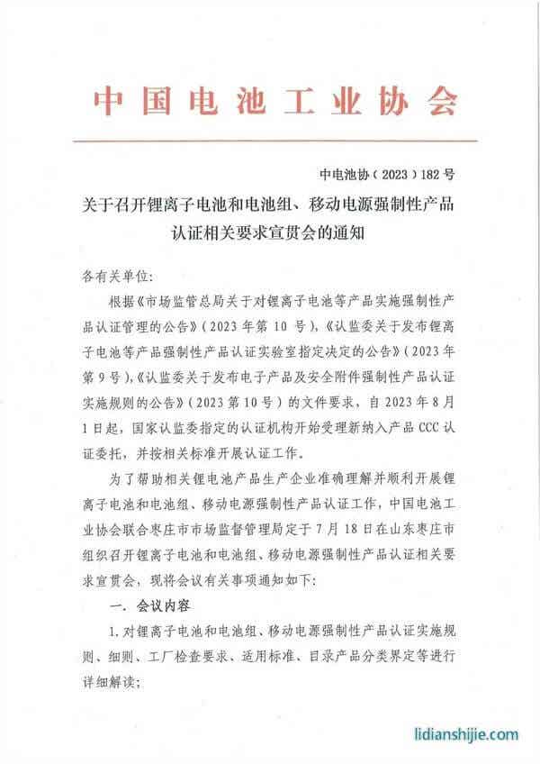 關于召開鋰離子電池和電池組、移動電源強制性產品認證相關要求宣貫會的通知 2023-07-05 822220 核心提示:下載附件:參會回執表.docx作者:中國電池工業協會 下載附件: 參會回執表.docx 作者:中國電池工業協會 點贊 0舉報收藏 0打賞 0評論 0分享 103 更多>同類鋰電資訊 • 容誠電子落地濟源 萬洋拓展鋰電領域新布局 • 資源稅對鋰礦成本的影響 • 美國轉向油車開始取消亞洲鋰電池訂單,美股鋰電 • 鋰電池打響漲價“第一槍”,德加能源電池系列價 • 感覺未來主流會是大電池增程 • 德方納米榮獲2025年度正極材料優質供應商稱號 • 奔馳正加速推進電動車固態電池上車進程 • 磷酸鐵鋰電池漸成市場主力 • 迷之碳酸鋰庫存 • 鋰電產業鏈周記 | 寧德時代聯手五大車企發布10