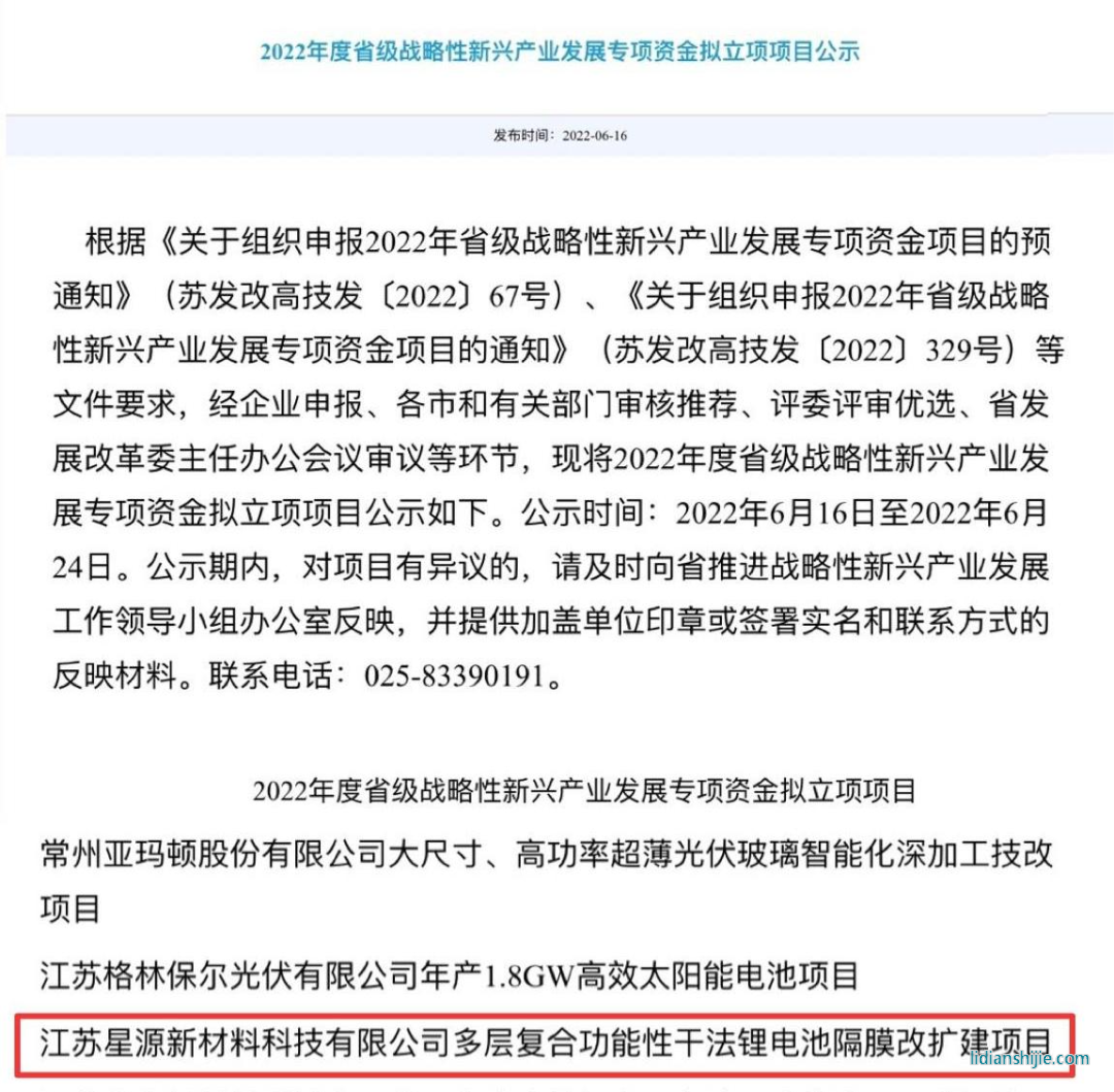 核心提示:6月16日,星源材質全資子公司江蘇星源“多層復合功能性干法鋰電池隔膜改擴建項目”入選2022年度江蘇省戰略性新興產業發展專項資