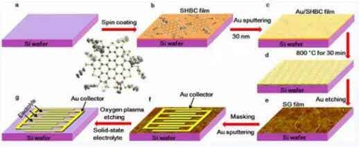 該研究團(tuán)隊利用納米金薄層的二維納米限域效應(yīng)和金催化作用,采用自下而上逐步熱解法成功制備出連續(xù)、均勻的硫摻雜石墨烯薄膜;以該薄膜為電極,采用微納加工技術(shù)構(gòu)建微型超級電容器。該電容器具有體積比容量高(582F/cm3),循環(huán)穩(wěn)定性好和功率密度高(1191W/cm3)等優(yōu)點(diǎn)。機(jī)理研究表明,納米金薄層的存在有利于形成穩(wěn)定的S-Au鍵、C-S鍵,從而實現(xiàn)了納米石墨烯主體結(jié)構(gòu)完整、硫元素均勻摻雜和薄膜厚度均一。該工作為自下而上法可控制備大面積、連續(xù)石墨烯薄膜提供了新思路;也為硫摻雜石墨烯提供了新方法,并證實了硫摻雜能顯著提高石墨烯薄膜的電化學(xué)性能。