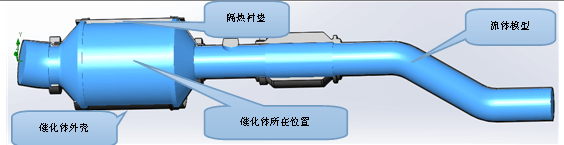 催化器的真實模型含有進氣管、前后端錐、催化體、隔熱襯墊、催化劑外殼、氧傳感器、波紋管、中間管等部件,相對復雜,因CFD的分析對象為流體,需對原始模型進行簡化及封閉處理,處理前后模型如圖1所示。