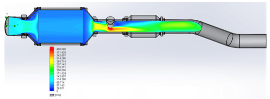 4)使用CFD技術,運用SolidWorks Flow Simulation模擬氣流進入催化器后流體場,預測了兩種催化體的背壓、速度和均勻性,間接反映出兩種催化體對汽車尾氣的凈化效率,以便于在實際中,對不同排放要求的車型,選擇合適的催化體。