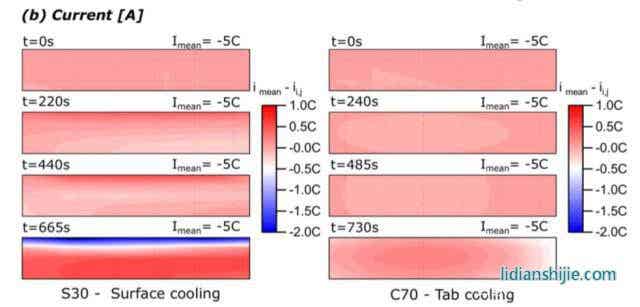 下圖為通過(guò)模型得到的采用表面散熱方式的S30電池和采用極耳散熱方式的C70電池內(nèi)部的溫度變化、電流分布變化和局部SoC變化,從下圖a我們能夠看到由于S30電池通過(guò)電池頂部表面散熱的方式對(duì)電池進(jìn)行散熱,因此能夠看到電池內(nèi)部出現(xiàn)了明顯的溫度梯度,相比之下采用極耳散熱方式的C70電池溫度就要均勻的多。