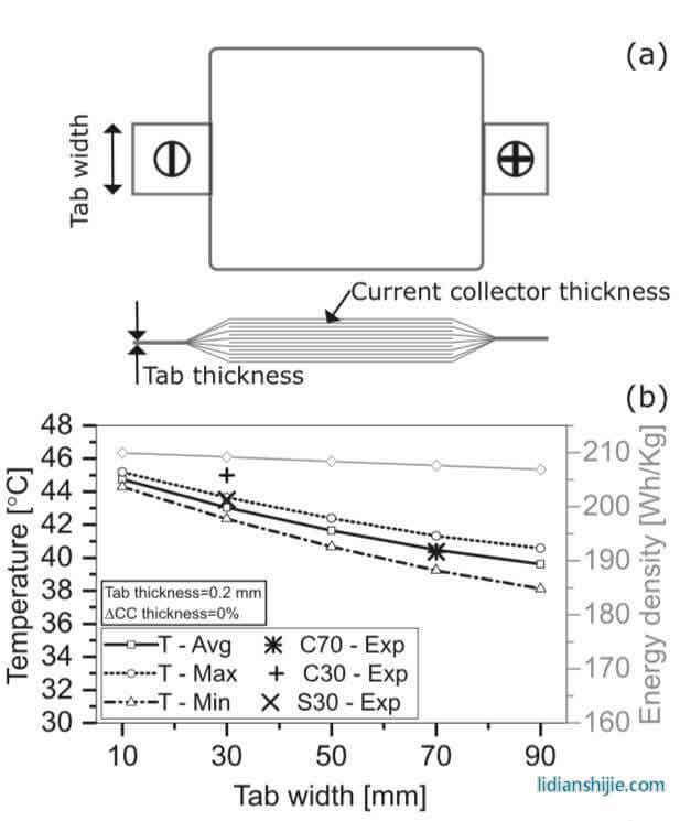 作者以散熱效果較好的C70電池作為基礎(chǔ),對(duì)極耳的結(jié)構(gòu)進(jìn)行了優(yōu)化設(shè)計(jì),下圖b展示了極耳寬度對(duì)于電池在放電過(guò)程中的平均溫度、最高溫度和最低溫度的影響,從圖中能夠看到電池極耳寬度從10mm提高到90mm,放電結(jié)束時(shí)電池的平均溫度從44.5℃下降到了39.5℃,電池在長(zhǎng)度方向上的最大溫差從1℃增加到了2.4℃,由于極耳重量的增加,電池的重量能量密度從210Wh/kg降低到了207Wh/kg。