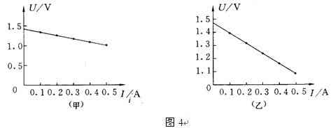 2、應注意當電池內(nèi)阻較小時,U的變化較小,圖象中描出的點呈現(xiàn)如實驗圖4(甲)所示狀態(tài),下面大面積空間得不到利用,所描得的點及做出的圖線誤差較大.為此,可使縱軸不從零開始,如實驗圖4(乙)所示,把縱坐標比例放大,可使結(jié)果誤差小些.此時,圖線與縱軸的交點仍代表電源的電動勢,但圖線與橫軸的交點不再代表短路狀態(tài),計算內(nèi)阻要在直線上選取兩個相距較遠的點,由它們的坐標值計算出斜率的絕對值,即為內(nèi)阻r.