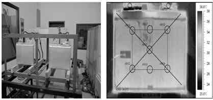 用熱成像設(shè)備測試了電池在200A電流下放電和100A電流下充電時表面的溫升情況,如圖4、5所示。