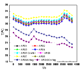 其中,熱成像結(jié)果顯示的顏色不同顯示溫度的變化情況。對試驗過程中電池的表面溫度取圖中所示的10個區(qū)域,分別用AR1、AR2、AR3、AR4、AR5、AR6、AR7、AR8、AR9、AR10標記。