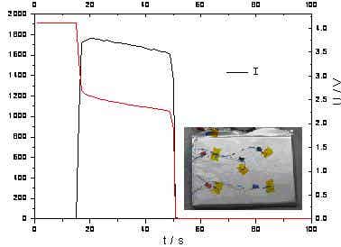 圖9為電池短路過程中電池電壓、電流的變化曲線測試結(jié)果圖。從圖中可以看出,電池在經(jīng)過短