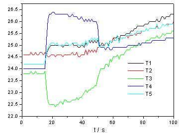 整個過程中,溫度點1~5的變化如圖10所示,從圖中可以看出,在短路時間(有電流存在),采集點3、4呈現(xiàn)不同的溫度變化趨勢,而1、2、5采集點的溫度變化趨勢基本一致。引起這種變化的主要原因是MGL在電池設(shè)計方面上進行了改進,有效的防止了高電流通過時引起的熱失效現(xiàn)象。整個短路過程中,電池在外觀上無任何變化,電池沒有燃燒、沒爆炸,符合安全標準。