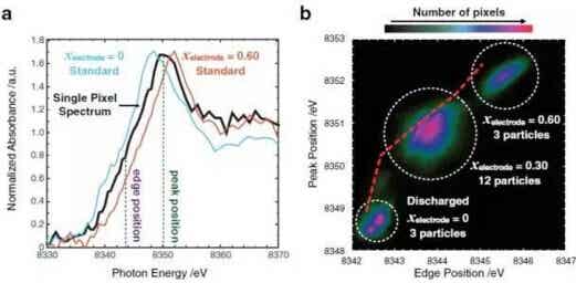 因此優化NCM材料二次顆粒的結構,有助于減少顆粒內部應力和Li分布不均勻性,從而提高材料的循環壽命。試驗中William E. Gent等人采用了共沉淀法合成了NCM材料的前軀體,研究發現該材料的二次顆粒的直徑在10-15μm,一次顆粒的直徑在500nm左右。實驗中采用了觀察Ni K邊際吸收光譜的方式表征了Li在材料二次顆粒中的分散狀態。研究顯示,在原始顆粒和完全放電的顆粒中Li的分布是十分均勻的,但是在SOC值為0.3和0.6的時候,即便是經過了10個小時的擱置,二次顆粒中的Li分布仍然十分不均勻。同時也發現,充電電流和靜置時間對這種不均勻性并沒太大的影響,充電電流從1.1C降低了C/110,Li分散的不均勻性并沒有太大的改善,靜置170h鋰離子電池分散不均勻的現象并沒有明顯的改善。